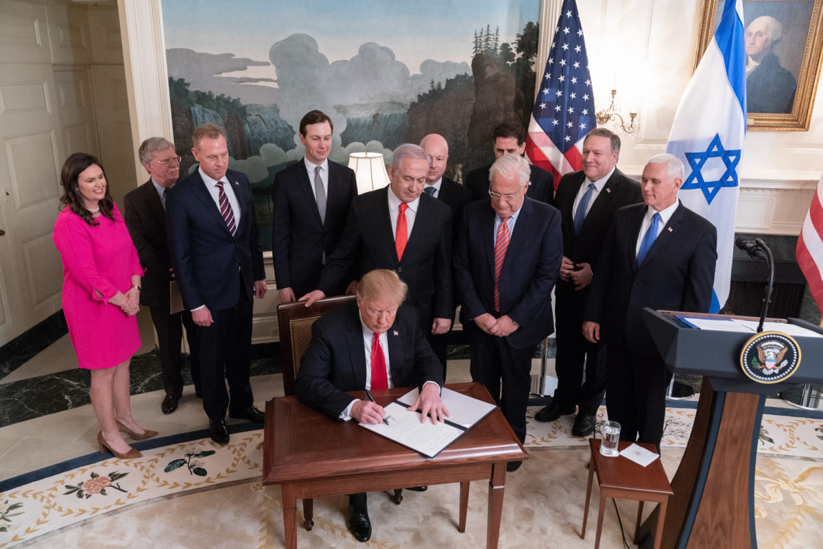 President Donald Trump signed a proclamation recognizing Israel's sovereignty over the disputed Golan Heights territory.