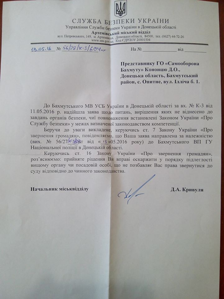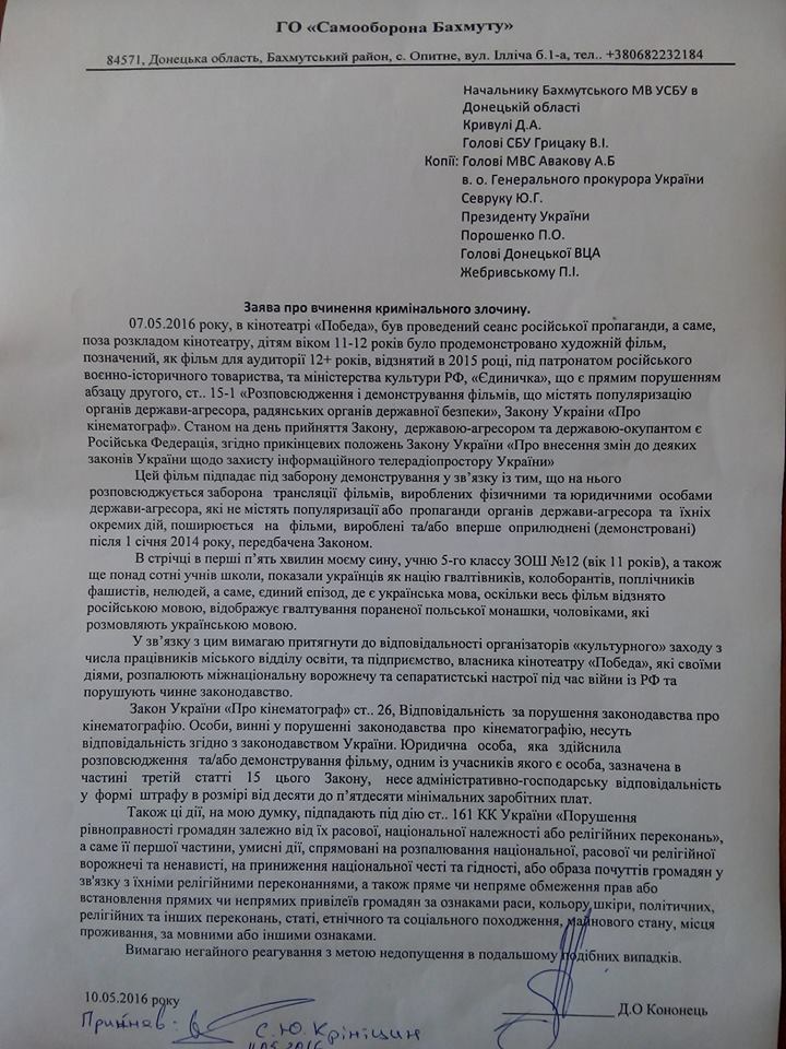 Житель города Бахмута в Донецкой области (ранее город назывался Артемовск — ред.)Дмитрий Кононец опубликовал у себя в Facebook ответ от СБУ по поводу показа школьникам в его городе российского пропагандистского фильма «Единичка». Как известно, в этом фильме украинцы изображены в роли насильников женщин.
