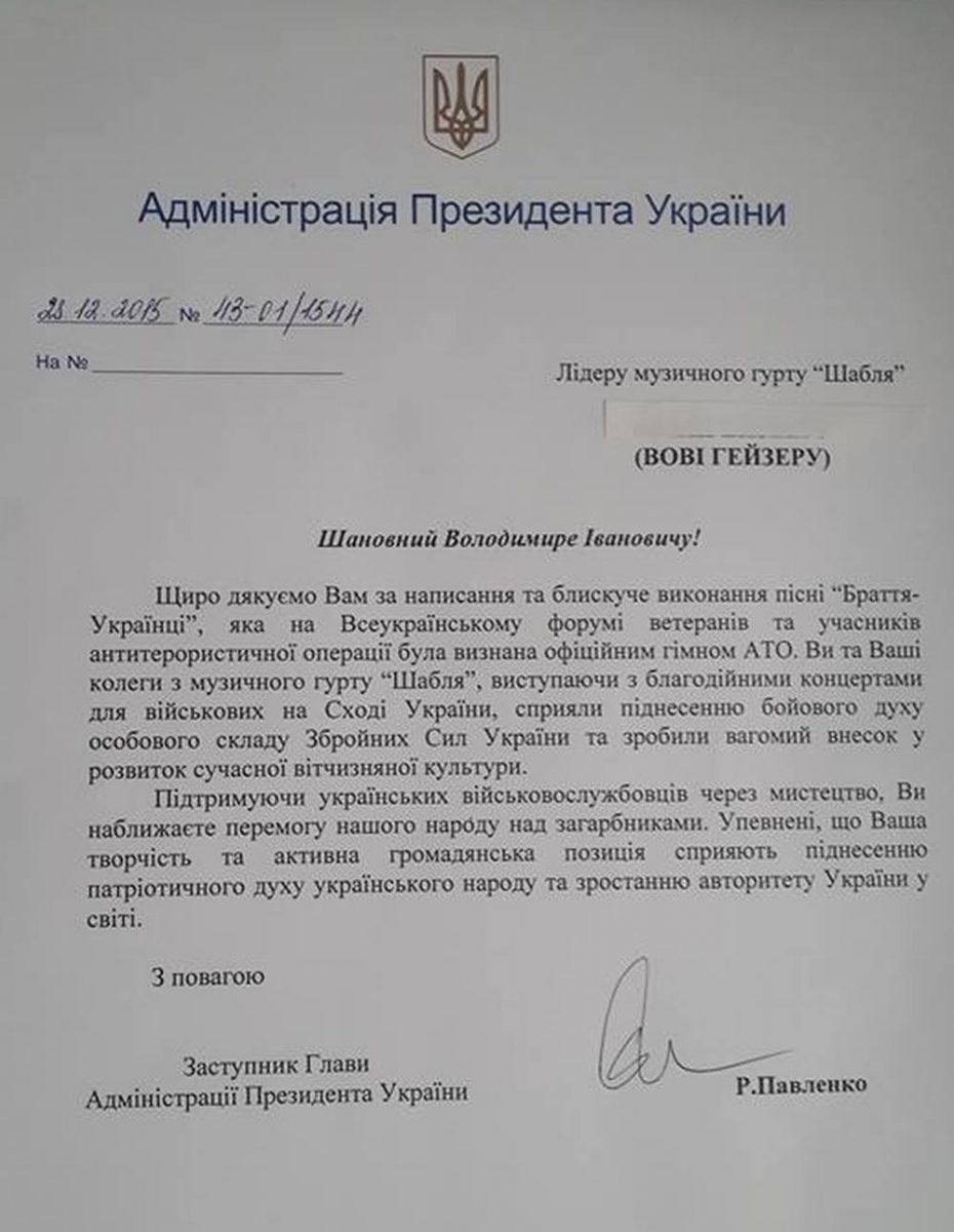 Песню «Браття українці» украинской группы «Шабля» официально признали гимном АТО. Как сообщается, замглавы Администрации Президента Ростислав Павленко вручил лидеру группы «Шабля» Вове Гейзеру документ об официальном признании песни гимном АТО.