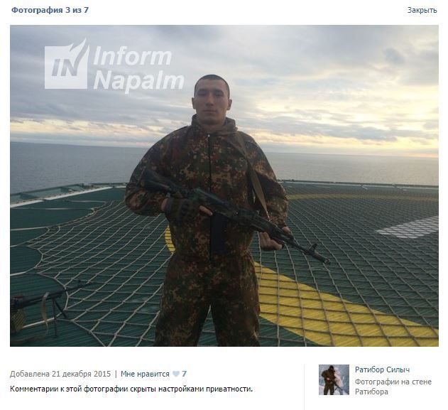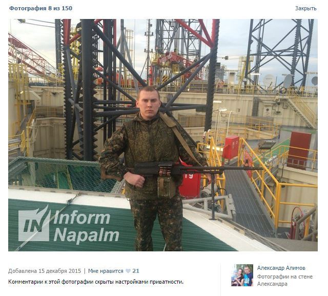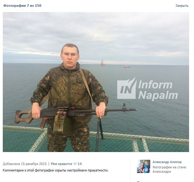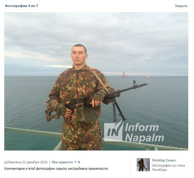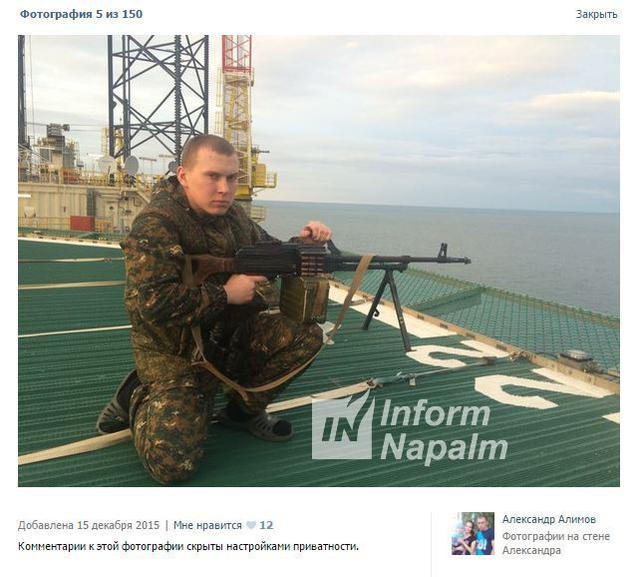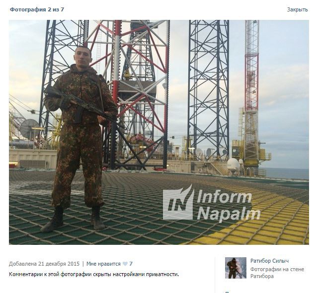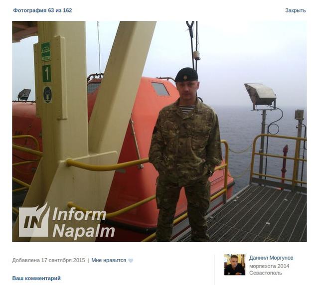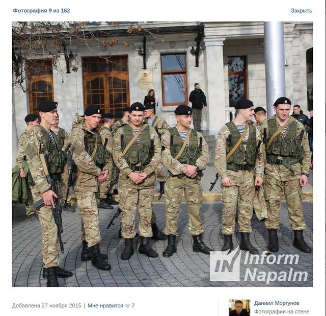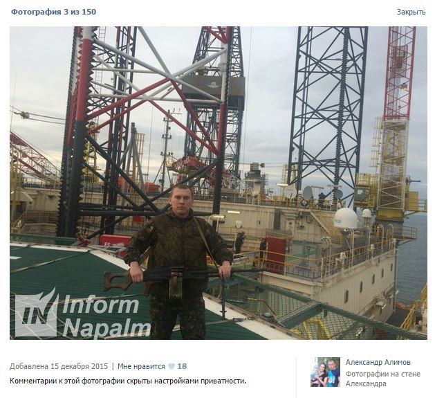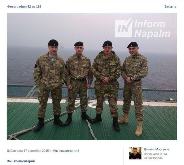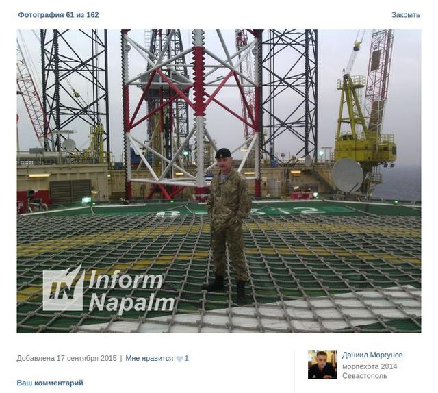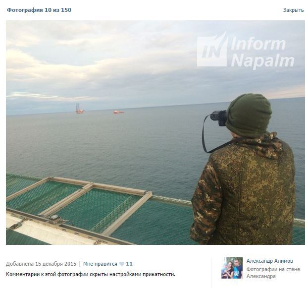 Также установлено, что охранные функции вышек, вместе со спецназовцами ГРУ, выполняло и подразделение 810-ой бригады морской пехоты Черноморского флота РФ. Данную информацию подтверждают фотографии со странички морского пехотинца Данилы Моргунова(архивстранички, альбома и контактов).