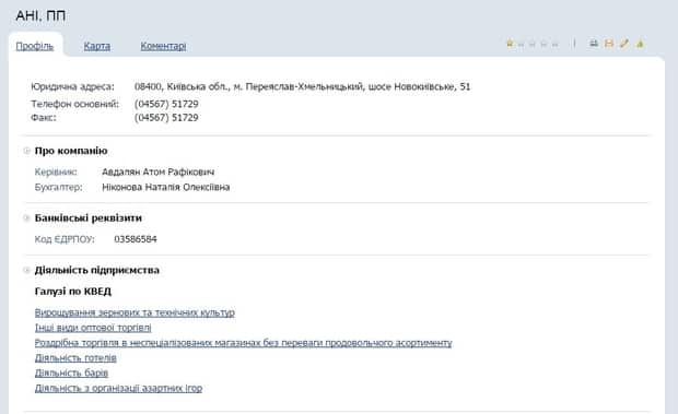 Также, согласно информации на сайте горсовета Переяслава, бизнесмен владеет частным предприятием «Ани».