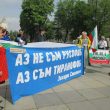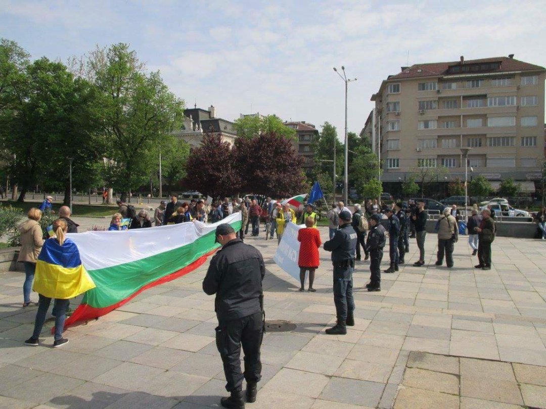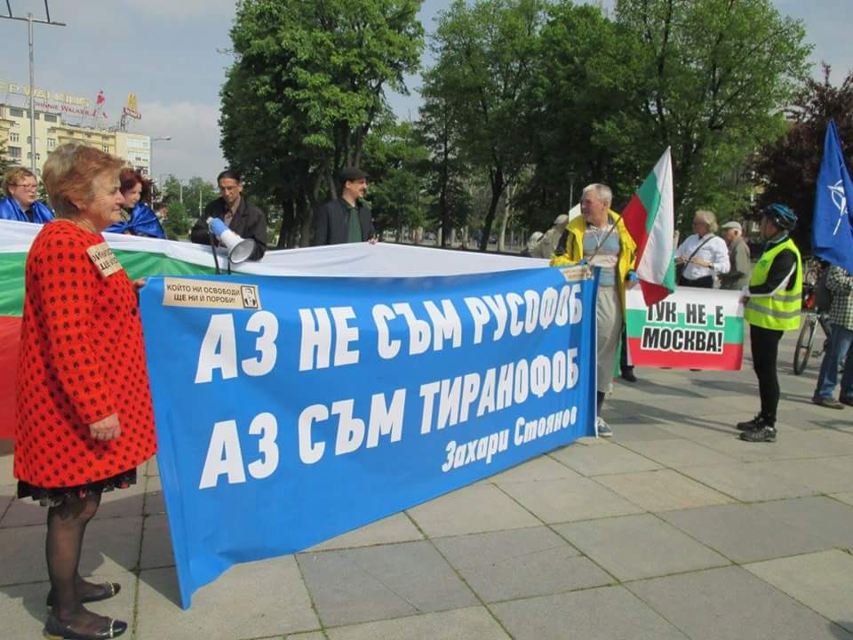 Участники манифестации под болгарскими, украинскими и грузинскими флагами выступили против агрессивной политики Кремля в Европе и демонстрировали плакаты с надписями «Здесь не Москва», «Червены боклуци» (на болгарском «красный мусор»), «Stop Putin. Stop war», «Свобода или СССР».