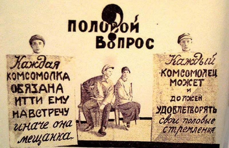 После Переворота, устроенного большевиками осенью 1917 года и названного позже «Великой Октябрьской Социалистической Революцией», страна начала стремительно деградировать становиться на новые большевистские рельсы, официально было объявлено о сексуальной вседозволенности. На фото выше — реальные большевистские плакаты 1920-х годов — «Каждый комсомолец может и должен удовлетворять свои половые стремления», «Каждая комсомолка обязана итти ему навстречу, иначе она мещанка».