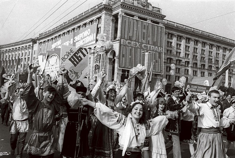 На фото — жители Киева на Крещатике, район Пассажа. Первомай 1986 года: