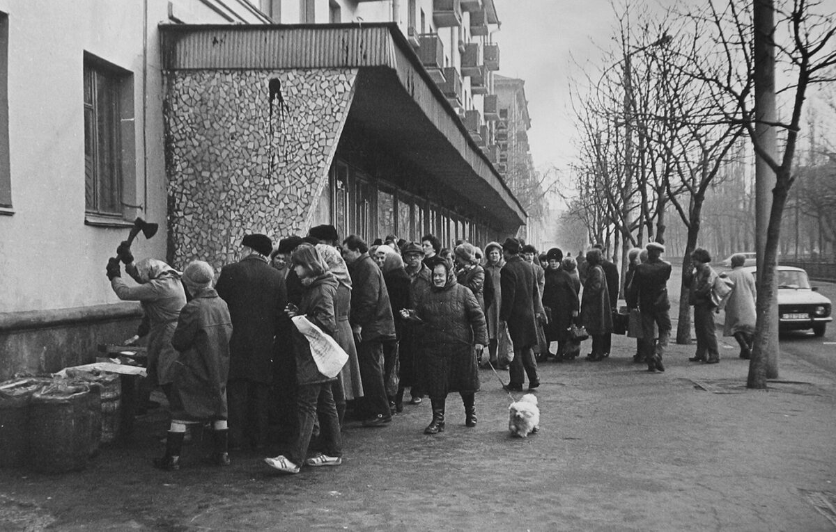 Начнём с моего любимого — очереди и магазины. Вот так выглядела торговля мясом в стране с величайшей, победной и неподдельной Космической программой — чтобы заполучить хоть кусочек дрянного мяса, люди были вынуждены отстаивать огромные очереди. Обратите так же внимание, что торговля ведётся на улице, мимо кассы, так торговали дефицитными продуктами вроде мяса или бананов — покупатели всё разметали за час прямо возле магазина по завышенной цене, после чего товар пробивался по кассе по реальной стоимости — а разницу торговые работники клали себе в карман.