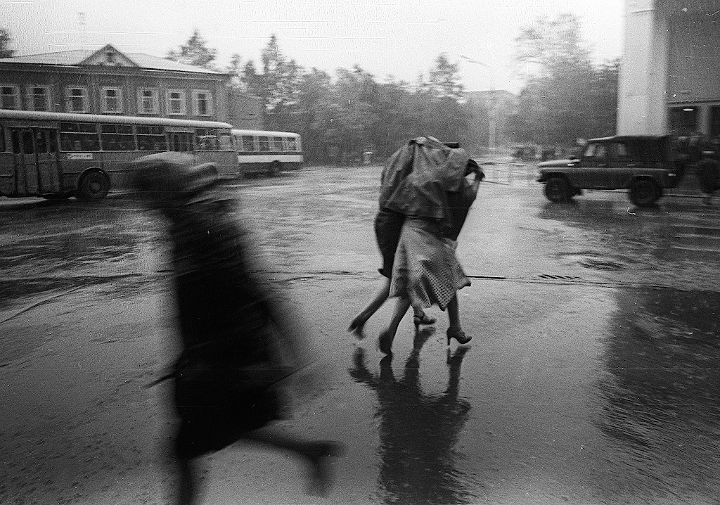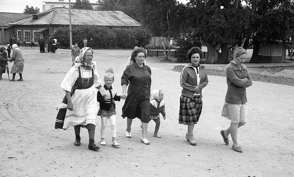 Городские улицы. Снова фотоснимок из абсолютного безвременья, на дороге нет даже асфальта, а примерные годы съёмки выдаёт только спортивная мастерка на женщине в центре кадра.