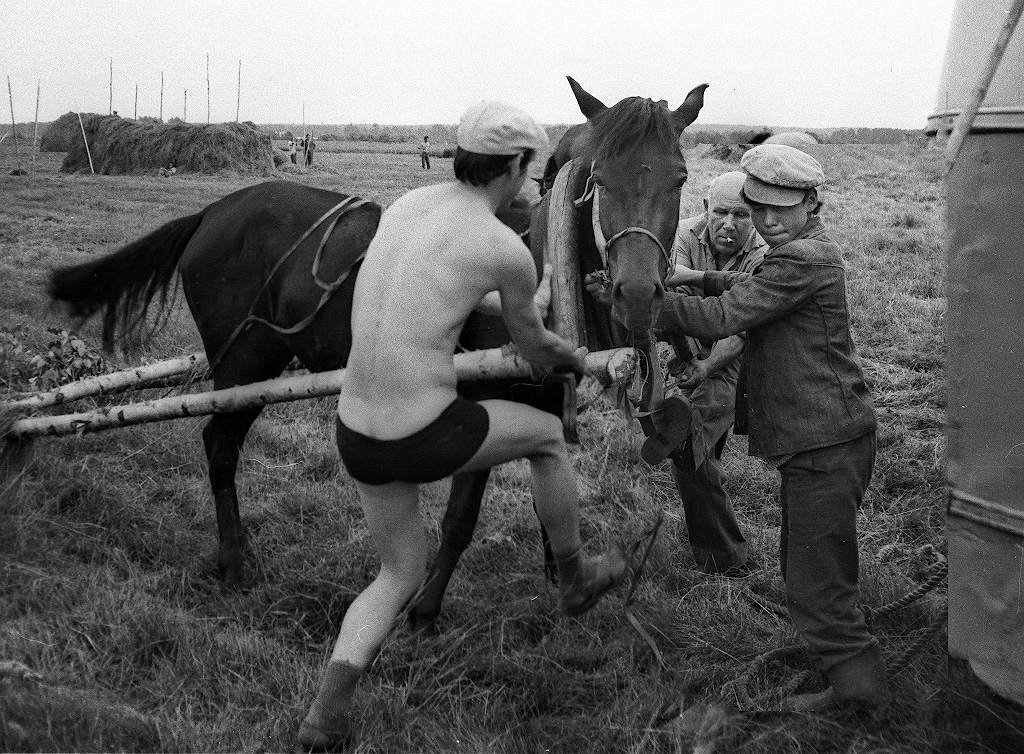 Сельская работа. Несмотря на все рассказы о «массовой механизации», многие работы на селе продолжали делаться так же, как и сотню лет назад — с помощью лошади и оглобли.