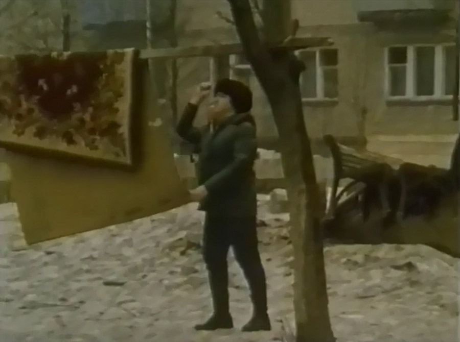 03. Следующими кадрами после телеграммы с рассуждениями о духовной жизни советских людей показан муж героини, который в убогом и грязном дворе выбивает ковёр. На этот трудовой подвиг его сподвигло, судя по всему, осутствие в семье героини нормального пылесоса — которые в тех же США были чуть ли не в каждой семье начиная с 1930-х годов.