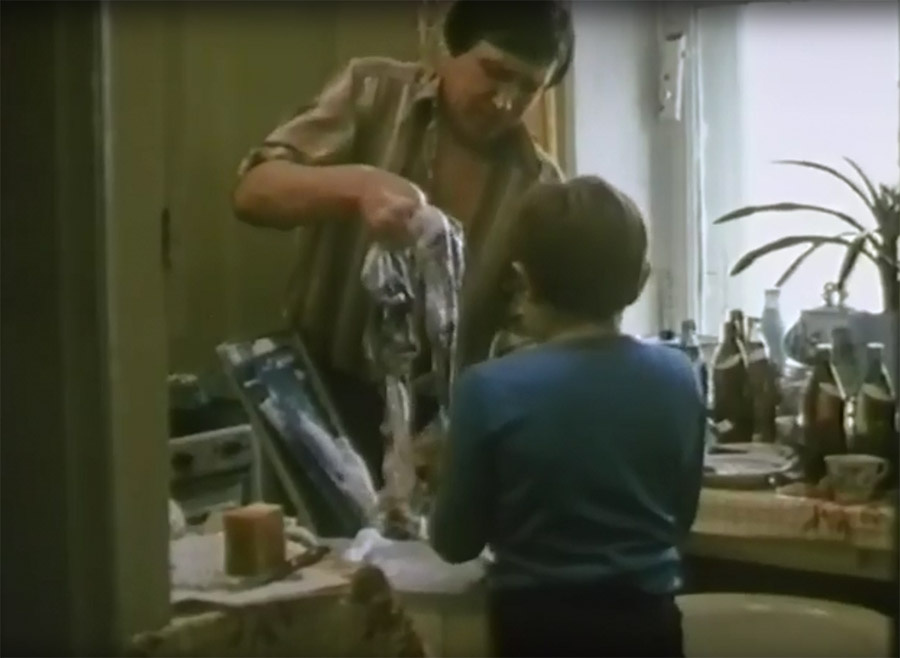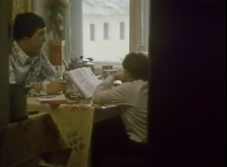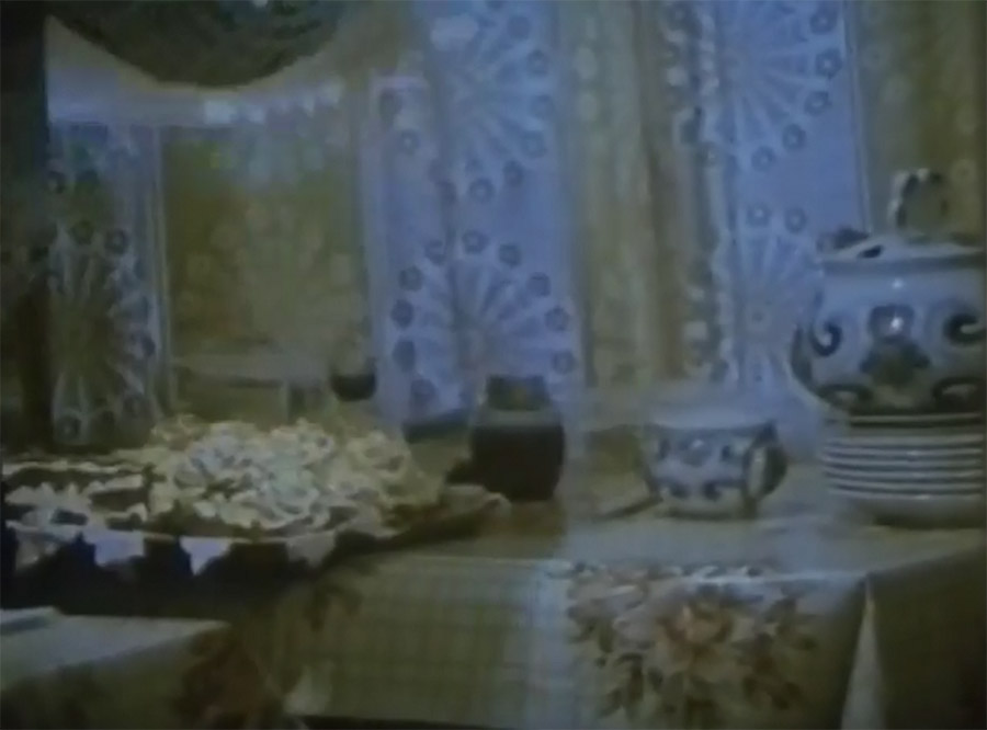 04. Не знаю, сколько комнат в квартире героини Голубевой, но её ребенок (которых в семье два) делает уроки на кухне, на застеленном липкой клеёнкой кухонном столе и поглядывая на электрический чайник, стоящий на подоконнике. Не исключено, что комната в квартире вообще одна, в которой советская героиня живёт с мужем и двумя детьми.