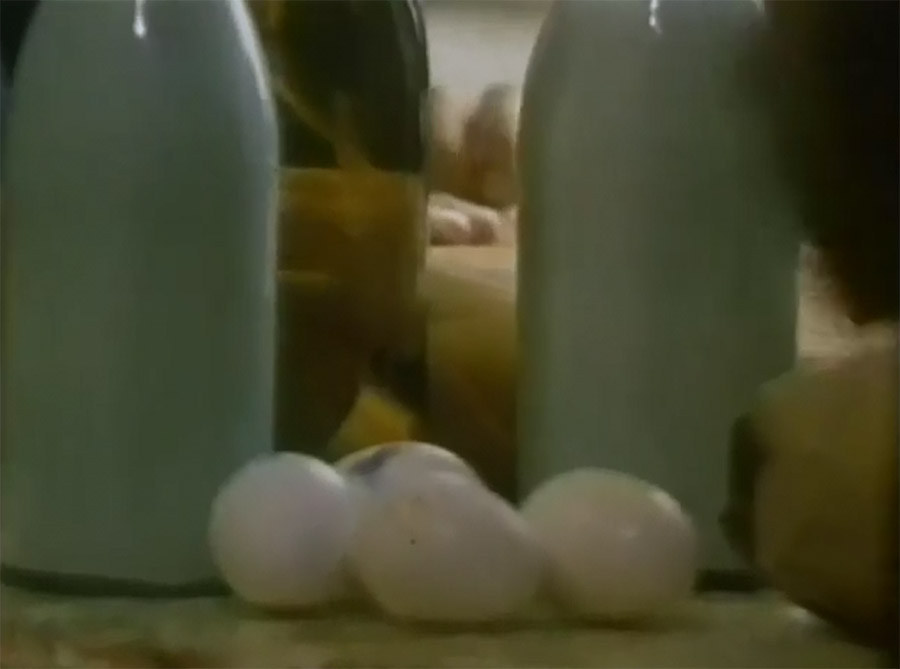 08. А вот и завтрак семьи, которая осталась без мамы — мама тратит все свои силы на производство. Семья героини Голубевой питается варёными яйцами с хлебом, а также есть ещё несколько бутылок с молоком или кефиром.