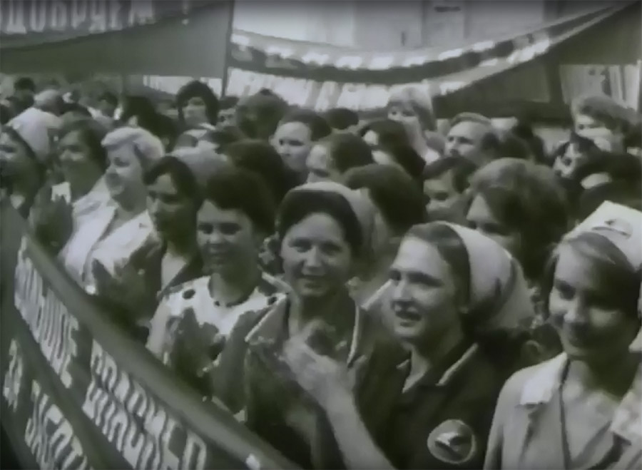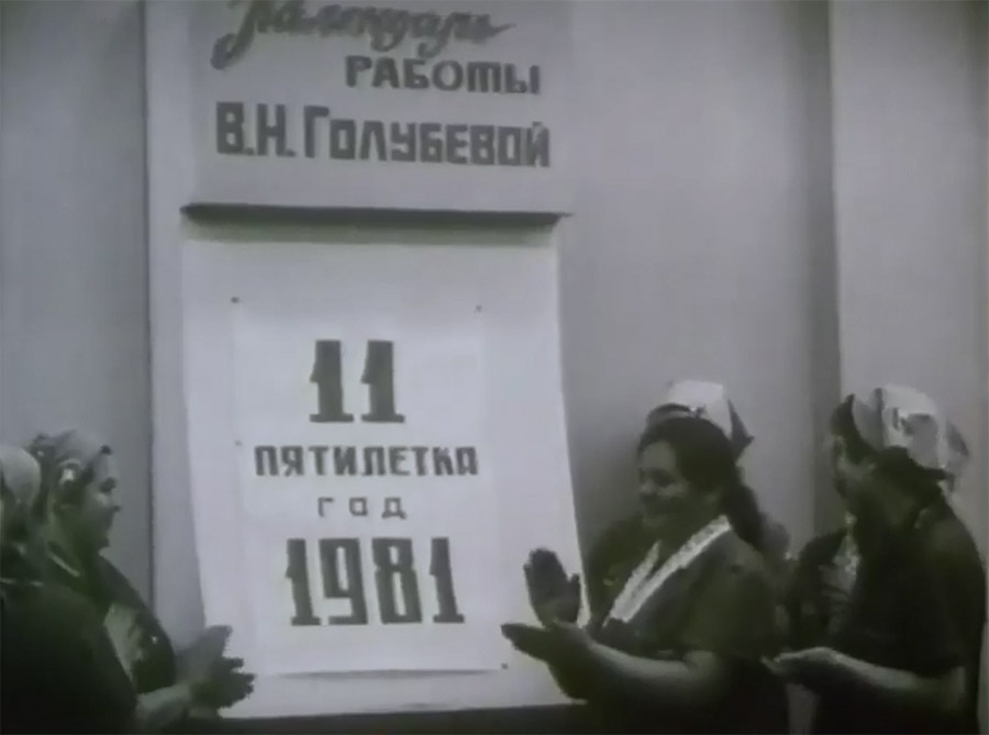 10. А режиссёр тем временем снова показывает производство. Вот Голубеву чествуют за то, что она выполнила пятилетку в два дня два года. Кстати, в Совдепии не говорили, что в нормальной экономической системе перепроизвосдтво — это далеко не всегда хорошо, и заставляли людей вырабатывать огромное количество того и этого, отдавая на работе жизнь и здоровье.