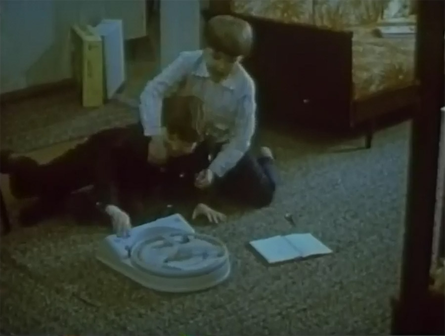 12. И вот снова дом — развлечения детей героини. Наверное, самое интересное, что есть у них из игрушек — это вот эта игра «За рулём» (которая кстати была содрана в СССР у западных аналогов). Обратите внимание на то, в каких условиях играют дети — отдельной детской у них нет, в кадре судя по всему либо общая гостиная с раскладным диваном-кроватью, либо вообще единственная в квартире комната (я больше склоняюсь к этому варианту).