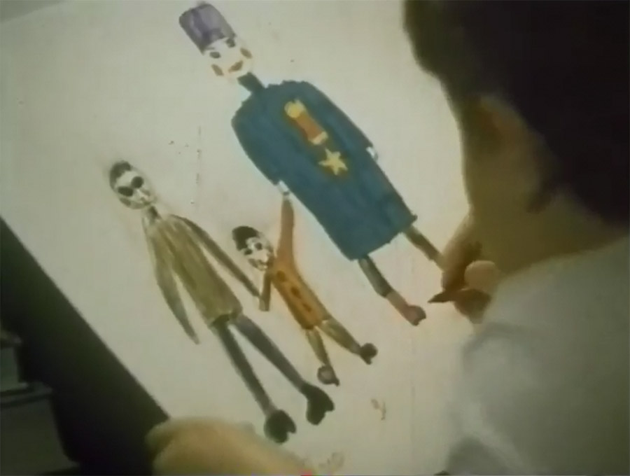 13. Ещё одно развлечение детей — рисование. В кадр попадает картина того, как один из мальчишек видит свою семью. Мама нарисована огромной, с гигантской звездой героя на груди. Слева не брат, как можно было подумать, а отец (что понятно из комментариев в фильме). Отец очень маленький и занимает, судя по всему, незначительное место в семейной жизни — всё вращается вокруг мамы и её награды.