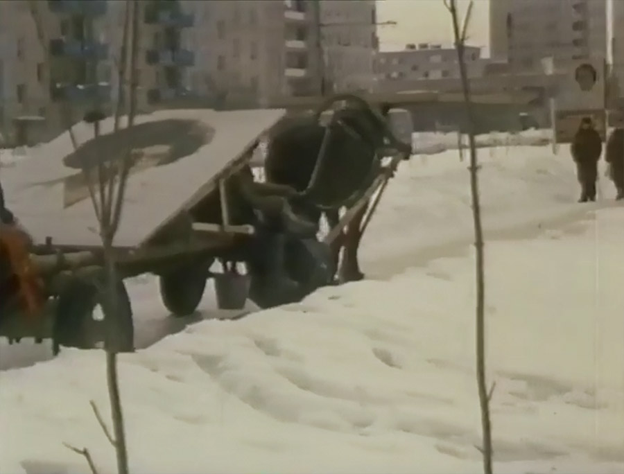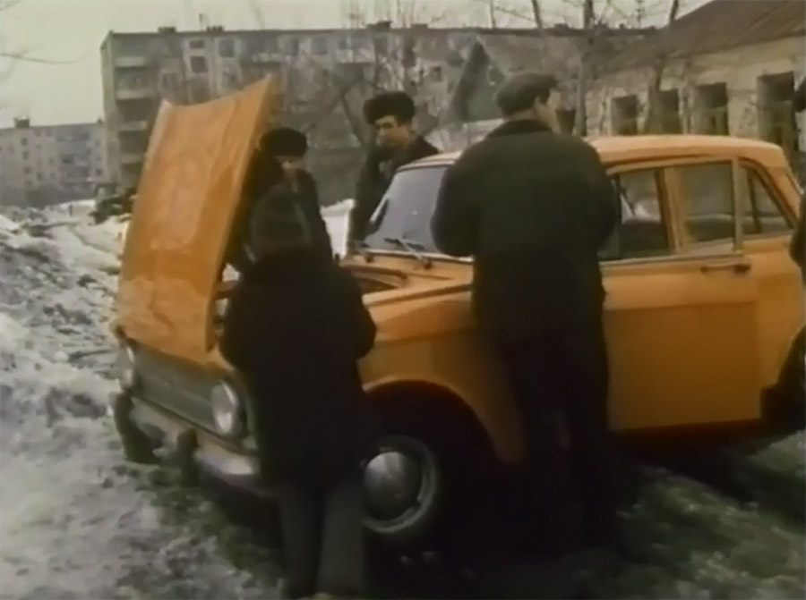 17. Затем показаны серые и грязные дворы, единственной яркой вещью в которых является оранжевый «москвич», который Валентине «дали бесплатно» за её героические подвиги. До зрителя доносятся обрывки разговоров мужиков, которые обсуждают единственную яркую вещь среди окружающей грязи и убожества — «Наша промышленность всё выпускает. Только надо пользоваться хорошо!». «Вот вырастешь, будешь трудиться так же, как эта женщина — и ты тоже получишь машину. И покупать не надо будет!».