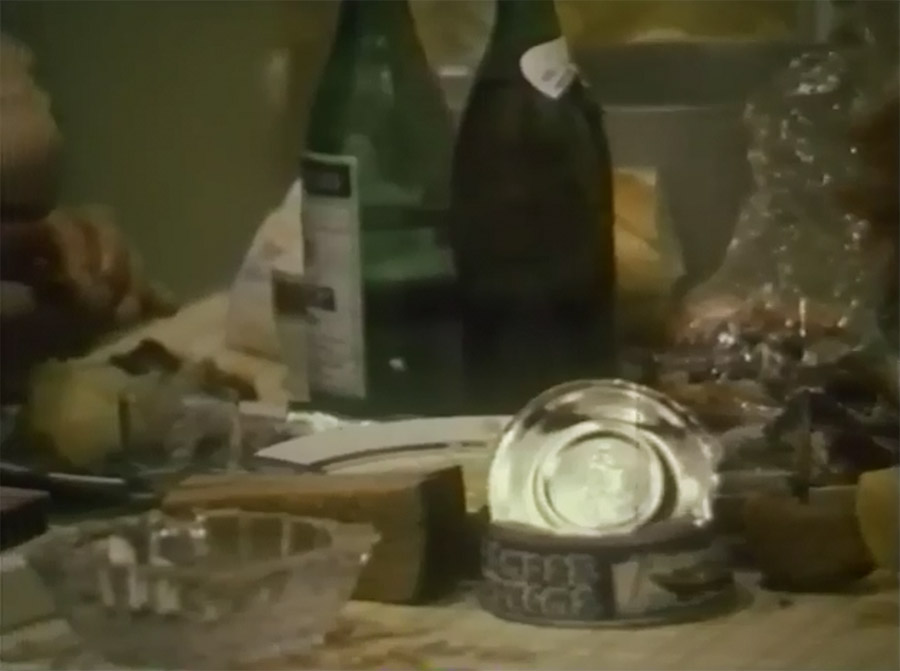 09. В следующем кадре можно увидеть гору пустых бутылок от каких-то газированных напитков либо пива. Кстати, обратите внимание на то, какой убогой является сама эта совдеповская кухонька — собственно, она вся и попала в этот кадр, снятый оператором от входной двери (слева в кадр попал дверной косяк). По площади это помещение метров 5 квадратных (если не меньше), с маленькой плитой на 2 конфорки (три ручки, центральная для духовки). Ещё в кухне есть два стола и какой-то эмалированный тазик.