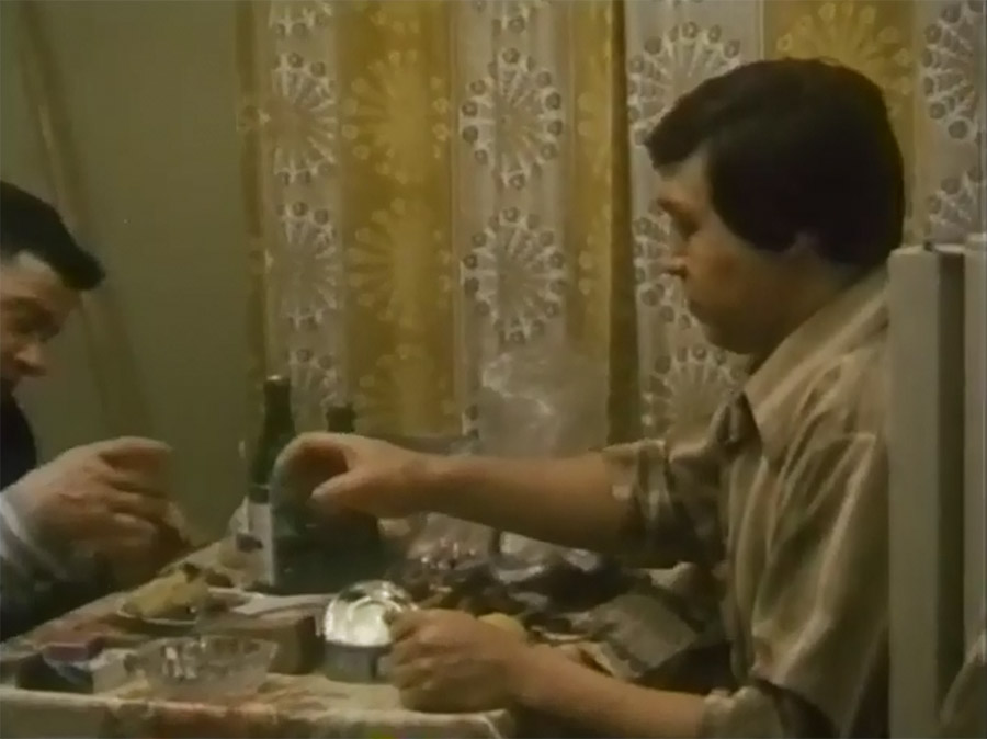 18. Дальше показан ужин семьи — в гости к папаше пришёл какой-то сосед, и они едят сухой чёрный хлеб с дешевыми рыбными консервами и варёной картошкой на газете. До зрителя долетают обрывки слов заплетающегося языка соседа — «наука идёт вперёд, всё совершенствуется, всё автоматика!».