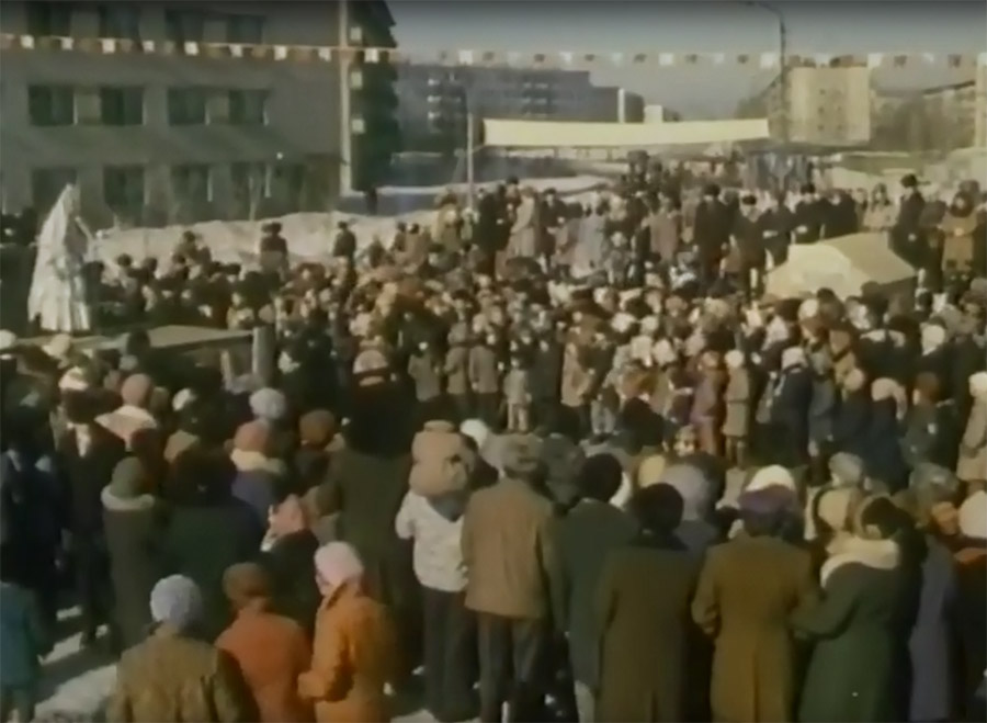 20. А затем показан какой-то городской праздник, типа Масленицы. Как же его праздновали в СССР — может быть, там были какие-то ярмарки с фонариками, подарками, уличной едой? Нет — посреди площади стоит толпа: