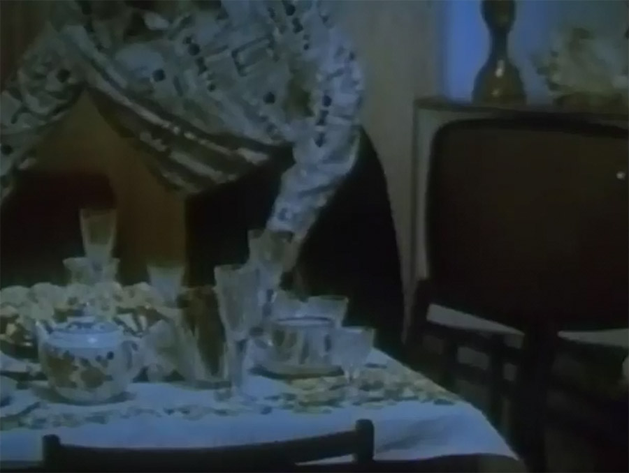 23. Стол накрывают в гостиной — которая, скорее всего, является единственной комнатой в квартире. Комната очень тесная — отец едва проходит между телевизором и столом — который слева подпирается раскладным диваном-кроватью.