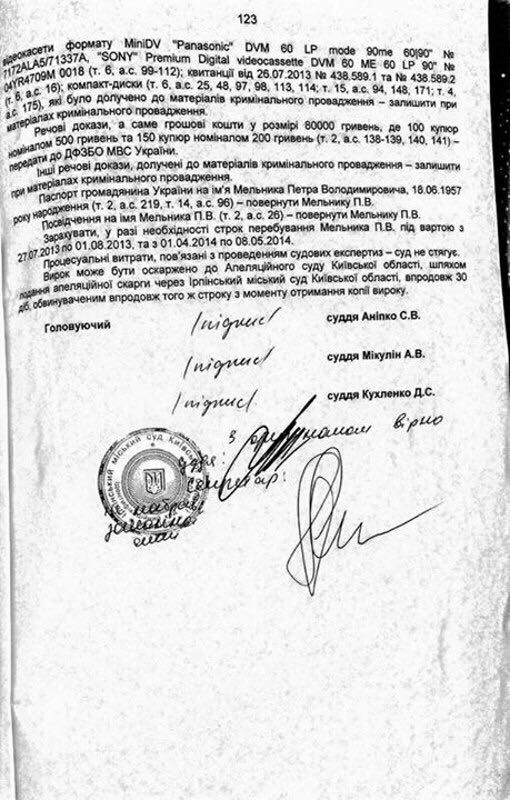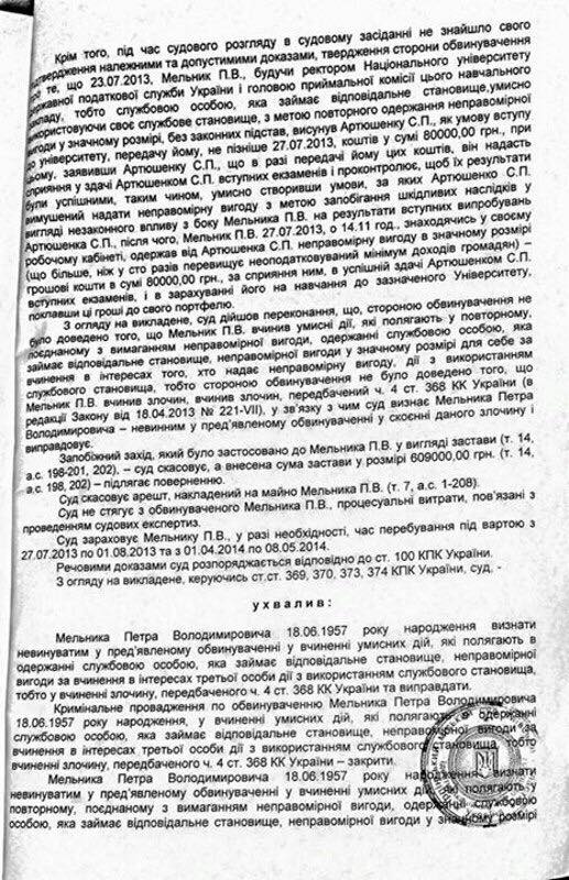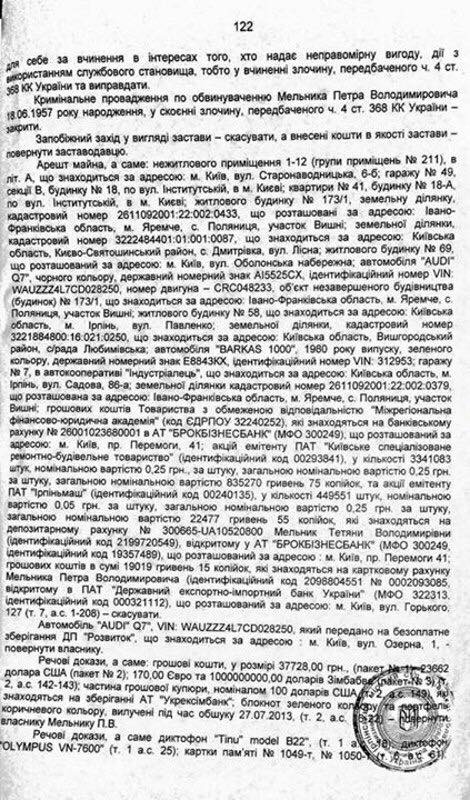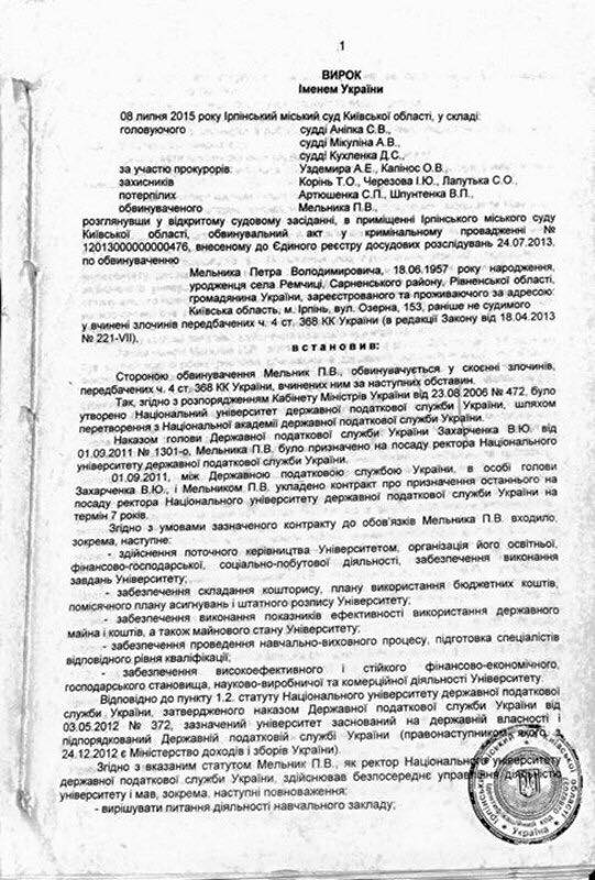 «Вчера в Ирпенском городском суде были сняты все обвинения с бывшего ректора Налоговой Академии Петра Мельника. Уголовное дело закрыли, Мельника признали невиновным. На фото — копия вчерашнего решения суда. Также снят ранее нанесенный арест на имущество Мельника, а это — десятки объектов недвижимости: квартиры, дома, земельные участки в Киеве, Ирпене, Ивано-Франковщине. Оказалось, что у Мельника был даже один миллиард долларов Зимбабве. Это почти 3 миллиона американских долларов»,-сообщает Ирина Суслова.