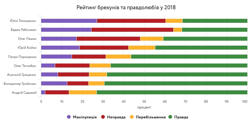 Аналитики VoxCheck проанализировали заявления украинских политиков и составили «рейтинг лжецов и манипуляторов 2018 года». Рейтинг возглавили Юлия Тимошенко, Вадим Рабинович и Олег Ляшко.