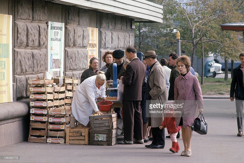 Где же советские граждане покупали свежие овощи и фрукты? Помимо овощных магазинов (где тоже редко бывал нормальный ассортимент), существовали также рынки и всеразличные точки выездной торговли. Вот этот снимок сделан в семидесятые годы, задолго до «проклятой перестройки» — торговая точка возле кинотеатра продаёт какие-то невзрачные яблоки, и за ними тут же выстраивается очередь. Думаю, в современном супермаркете вы даже и не посмотрели бы в сторону таких яблок, а в СССР это был ходовой дефицитный товар, который редко бывал в обычном магазине — за нормальными овощами и фруктами нужно было «побегать».