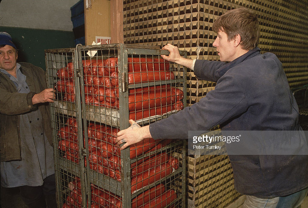 Более-менее свободно в колбасном отделе можно было купить такое — вареную колбасу сероватого цвета, с салом («любительская») либо без сала («докторская»). Никаких вам натуральных сырокопченых и сыровяленых колбас, никаких хороших сосисок, сарделек и колбасок к пиву, не говоря уже о вырезках, балыках и т.д. А ещё обратите внимание на цену — килограмм даже такой невзрачной колбасы стоит целых 3 рубля и 60 копеек — то есть, за среднюю советскую зарплату можно было купить всего 40-50 килограммов колбасы.