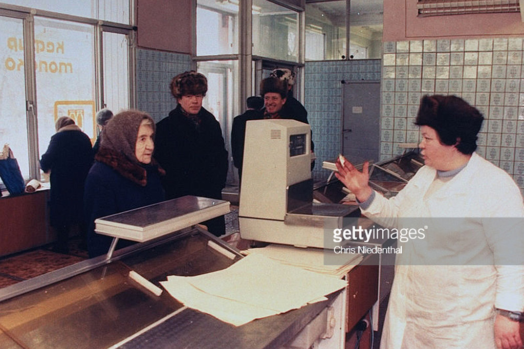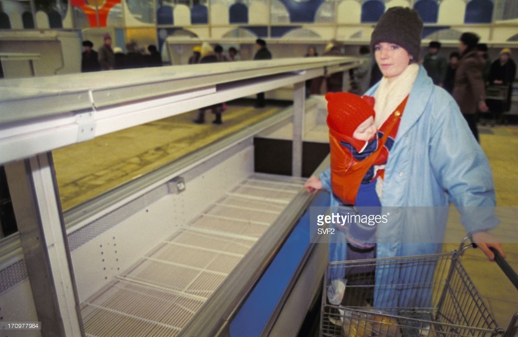 В самые последние годы СССР в магазинах и вовсе были полностью пустые прилавки. Это не метафора, смотрите сами — вот московский продуктовый магазин, сфотографированный в январе 1990 года.