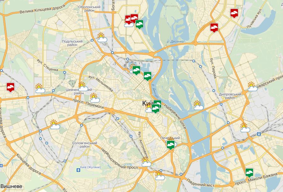Согласно данным после замеров СЭС показателей загрязненности воздуха по Киеву, которые были сделаны вчера вечером, оказалось, что в некоторых районах (Троещина, Оболонь, Борщаговка, Святошин) предельно допустимая норма содержания оксида углерода в воздухе превышена в 2-3 раза. В других районах показатели находились в пределах нормы.