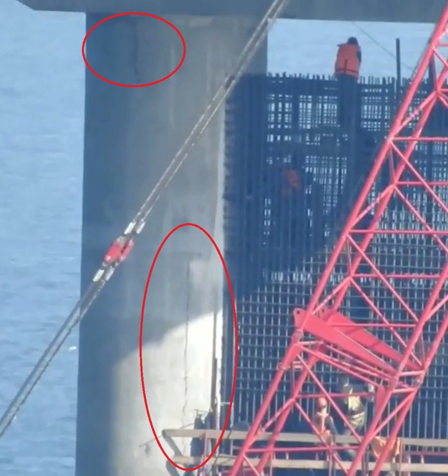 По словам СМИ, 296-ая опора моста, которая размещена практически посередине Керченского пролива, треснула в двух местах и трещины четко видны на фото.