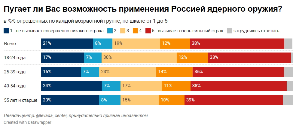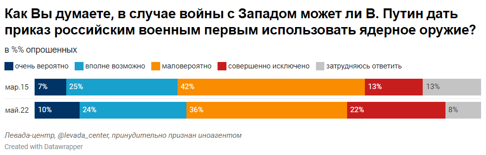 Согласно опросу, 34% граждан РФ считают вероятным применение Путиным ядерного оружия, при этом 10% россиян считают этот сценарий очень вероятным, 24% — вполне возможным. 58% опрошенных скорее исключают такую возможность: 36% думают, что это маловероятно, 22% — что это совершенно исключено.