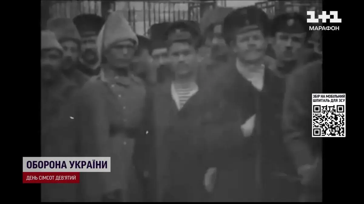 «1917 год, Софийская площадь. У колокольни собираются делегаты центрального совета, среди них был и Михаил Грушевский. Несколькими месяцами позже эти люди провозгласят о создании УНР. Возникнет — Украина. Новое государство быстро соберет мощную армию. Декабрь 1917 года — в армии 100 тысяч штиков. Но уже через два месяца армия становится в десять раз меньше», — говорится в сюжете.