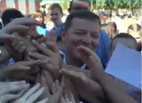 В кадре видно, как дети с шумом обступили Ляшко и тянули к нему руки, на которых тот ставил свои автографы.