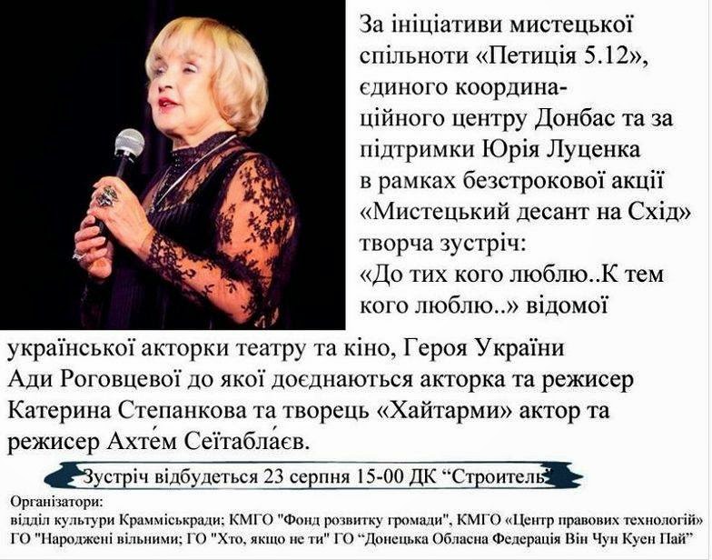 Днем 23.08.2014 состоялась творческая встреча Ады Роговцевой в Краматорске во дворце культуры «Строитель». Все подробности визита можно узнать из этой афиши.