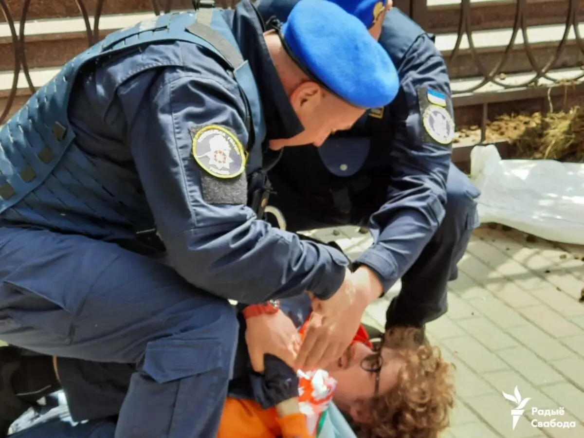 Белорусского активиста Петра Маркелова жестко задержали в Киеве во время перфоманса под белорусским посольством. Об этом сообщает белорусская служба «Радио Свобода» в телеграм-канале.