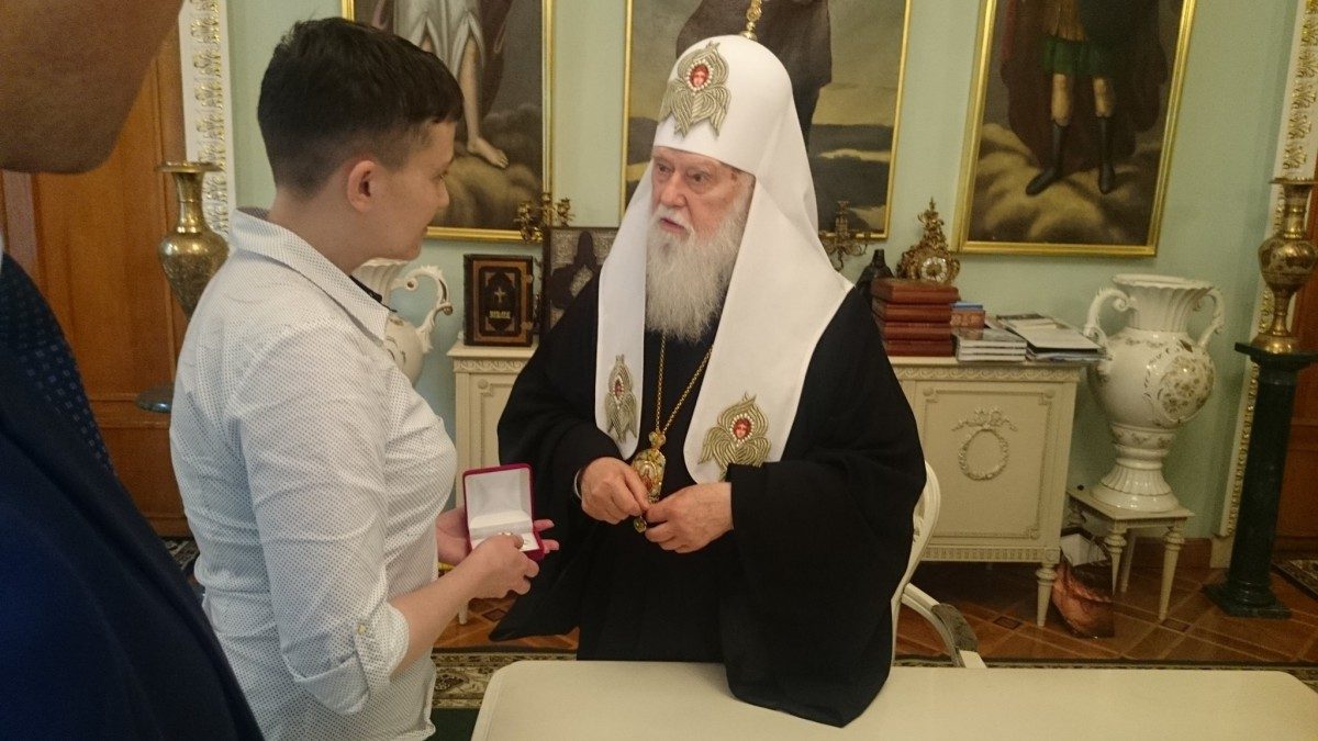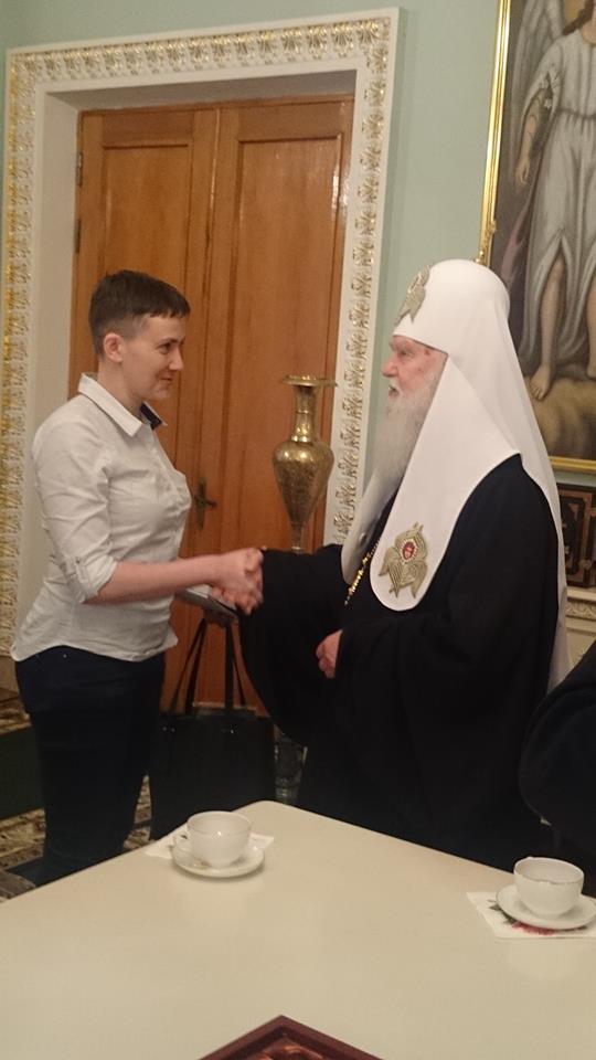 Народный депутат Украины Надежда Савченко встретилась с главой Украинской православной церкви Киевского патриархата, патриархом Филаретом. Об этом сообщается на официальной странице Савченко в Facebook.