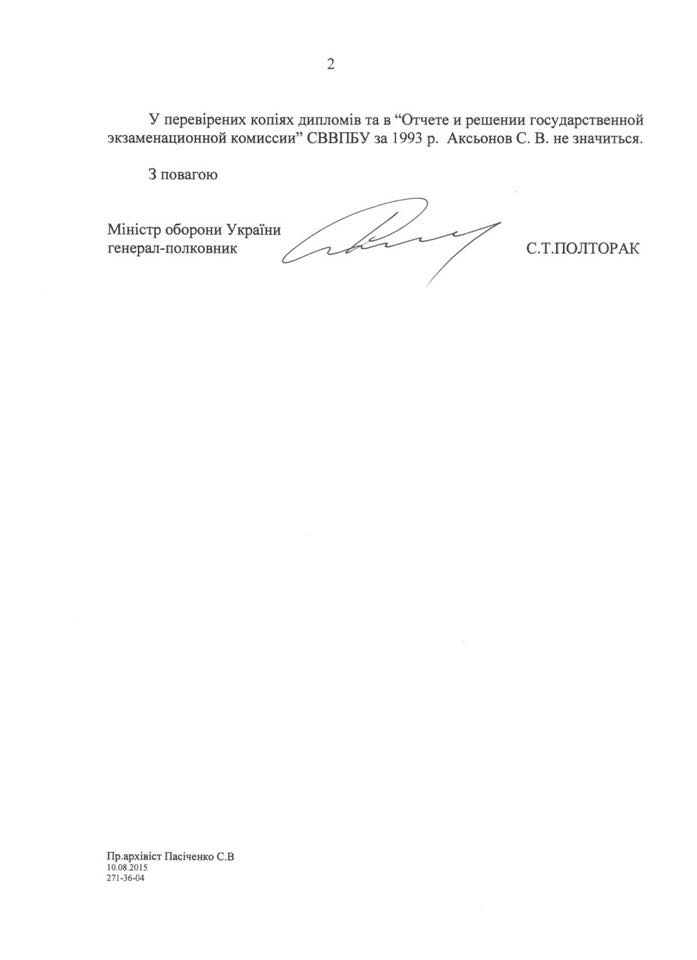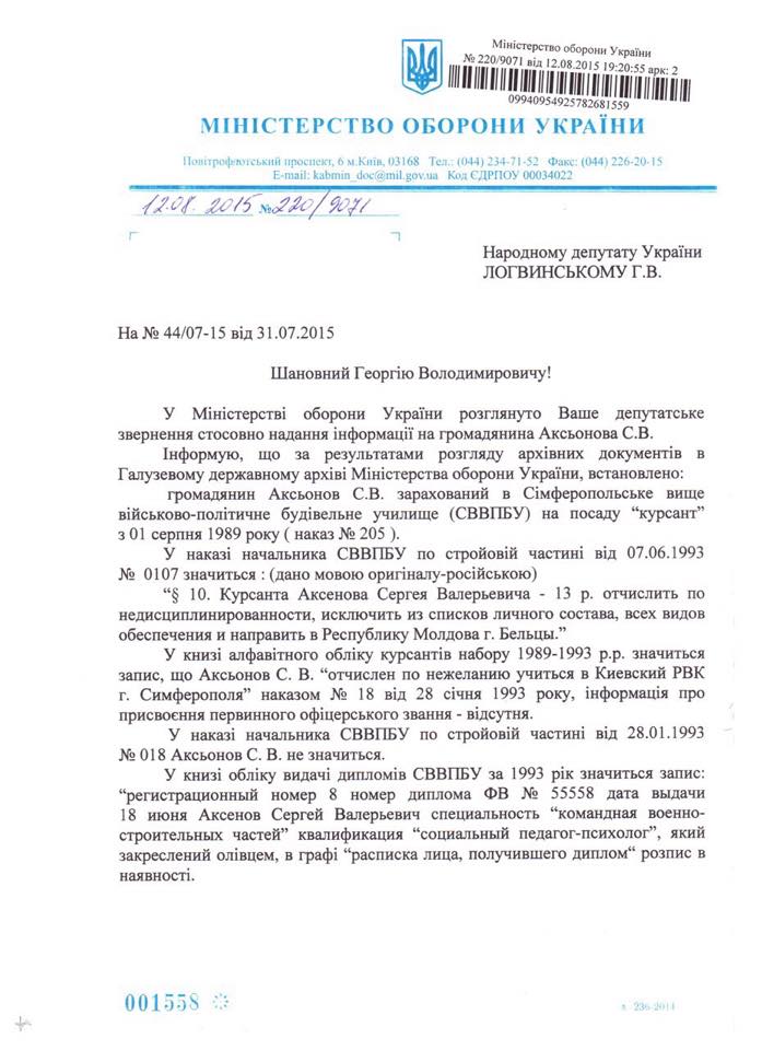 Информация об отчислении в июне 1993 года нынешнего главы оккупационной власти Крыма была получена в результате проверки архивных документов. При этом отмечается, что в книге учета выдачи дипломов СВВПСУ значится регистрационный номер диплома Аксенова. Но соответствующая запись зачеркнута карандашом, а в графе «расписка лица, получившего диплом» стоит подпись. Однако, сообщает Минобороны, в проверенных копиях дипломов и в «Отчете и решении государственной экзаменационной комиссии» СВВПСУ Аксенов не значится.
