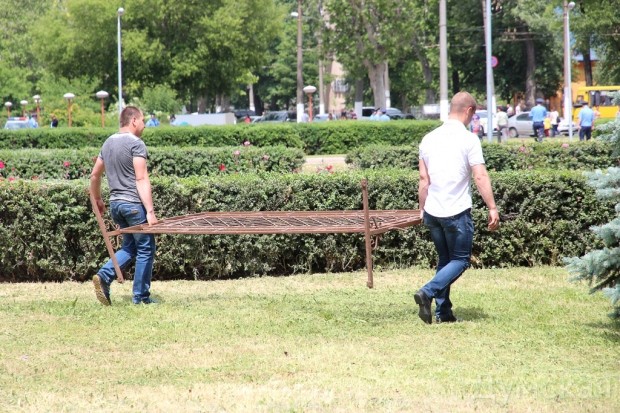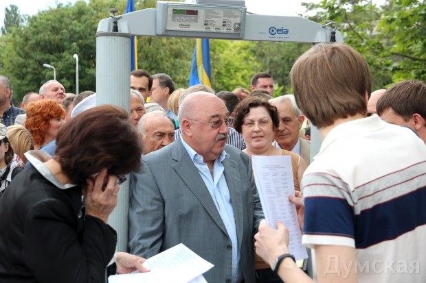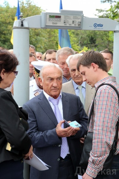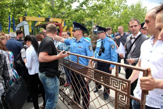 Здание и площадь перед ОГА оцеплены сотрудниками милиции, за оцеплением установили рамку металлодетектора.