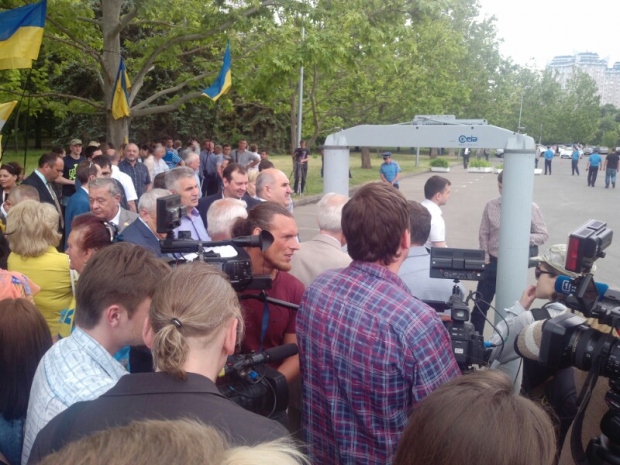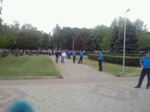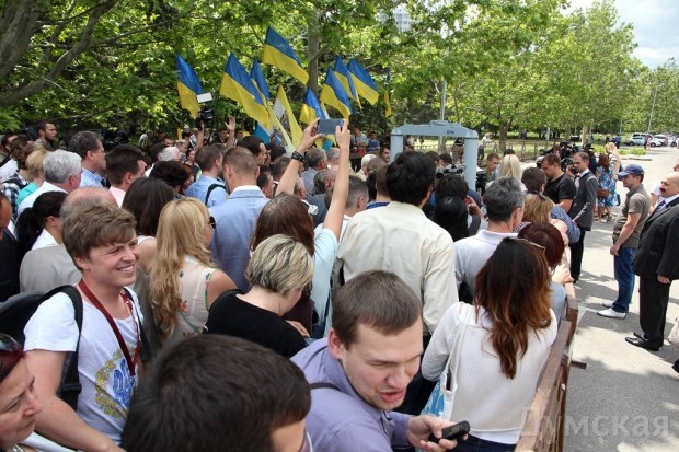 На подступах к площади собрались журналисты, депутаты областного и городского советов, чиновники, а также около тысячи людей с украинскими флагами. Никаких требований последние не выдвигают – говорят, просто хотят пройти к ОГА.