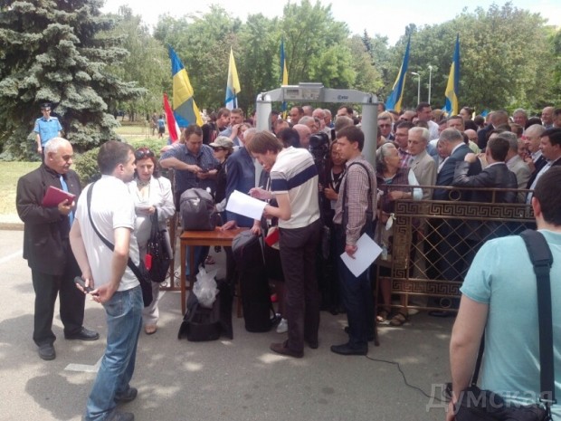 После обеда журналистов и депутатов начали пропускать через рамку. Представлять нового губернатора будет президент Петр Порошенко.