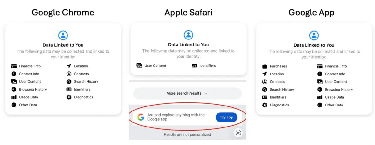 Forbes пише, що попри використання Safari, користувачі можуть зіткнутися з ризиками через інтеграцію сервісів Google. Зокрема, під час вебпошуку в Safari пошуковою системою за замовчуванням залишається Google. Наприкінці сторінки результатів відображається виділене посилання на Google App, яке легко натиснути випадково. Видання зазначає, що обсяг персональних даних, які збирає Google App, навіть більший, ніж у Chrome, і Apple поширює своє застереження і на цей застосунок. У матеріалі наголошується, що тим, хто хоче дотримуватися рекомендацій щодо приватності, варто уникати переходу до Google App через кнопку «Try app».
