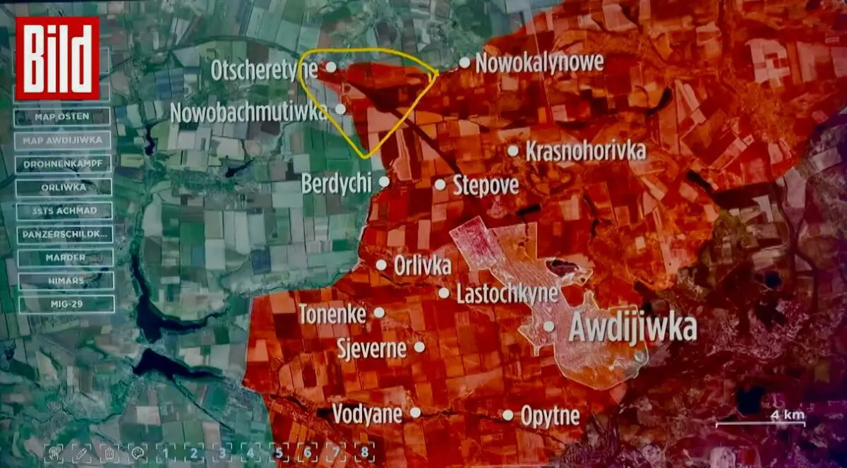 На початку тижня російські війська здійснили прорив на північний захід від Авдіївки, пройшовши 3 км углиб позицій ЗСУ до селища Очеретине. Про це повідомляє експерт BILD з аналізу відкритих даних Юліан Рьопке.