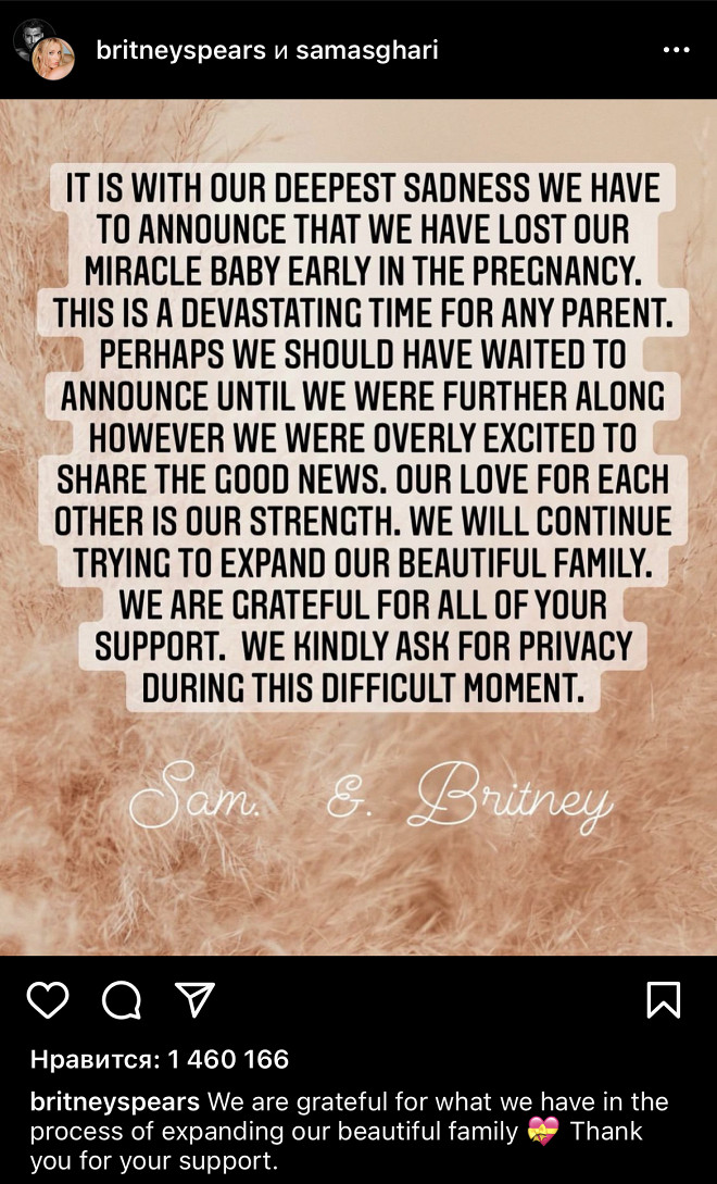 Американська співачка Брітні Спірс втратила дитину на ранній стадії вагітності. Пара зробила оголошення у соціальних мережах.