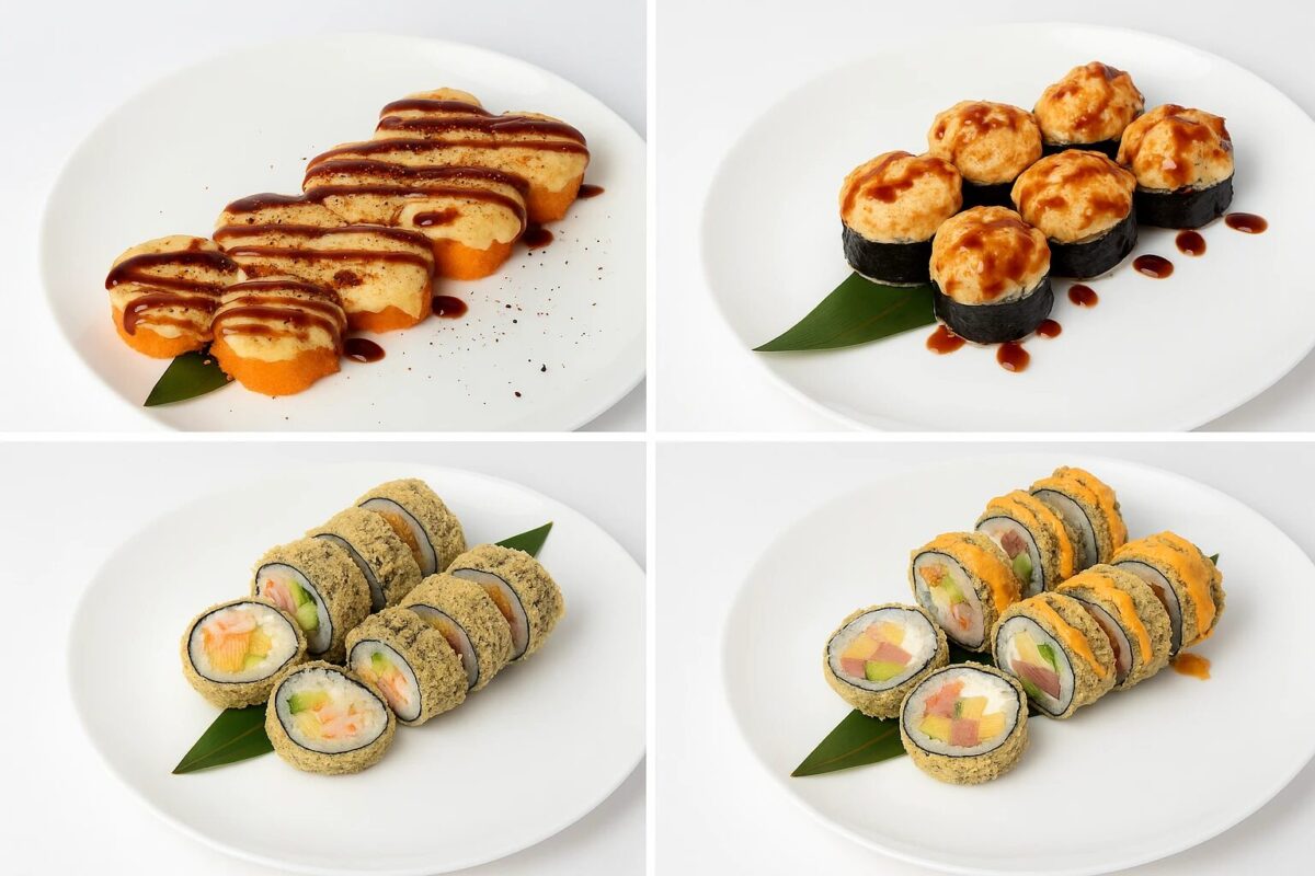Теплі суші мають свою “візитну картку” – шапочку з соусу. При температурі вона швидко розплавляється і карамелізується, утворюючи апетитну та ароматну скоринку. Для привабливого вигляду теплі роли часто прикрашають ікрою тобіко, кунжутом або зеленню. Якщо темпура роли хрумкі, то запечені мають соковиту та м’яку структуру. Їх смак більш вершковий, ніжно-кремовий.