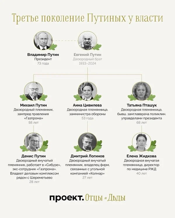 Крім того, дочка Євгена Путіна і сестра Михайла Анна Цивільова стала заступником міністра оборони, змогла зробити свого чоловіка Сергія міністром енергетики Росії і просуває вперед свого сина від першого шлюбу Дмитра Логінова. Зараз він володіє і керує фірмами, пов’язаними з вугільною компанією «Колмар», яку його мати отримала від друзів Путіна.
