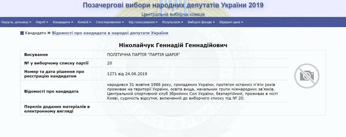У відкритих джерелах збереглася інформація про його участь у парламентських виборах за списками «Партії Шарія». Цю інформацію можна відшукати, зокрема, на сайті Руху «Чесно».