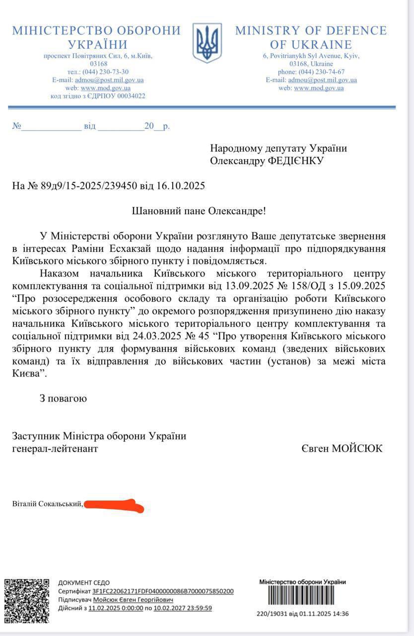 Як свідчить фотокопія відповіді від оборонного відомства, наказ про утворення Київського міського збірного пункту на ДВРЗ призупинили.