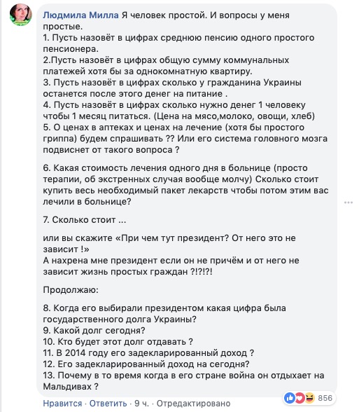 «А нах**на мені президент, якщо він не причому і від нього не залежить життя простих громадян?» – пише Людмила Мілла.