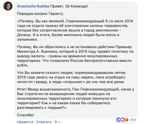 Анастасія Кулеба: Чому ви як Верховний головнокомандувач 5 липня 2014 року не віддали наказ про знищення колони терористів, яка без супроводу увійшла в місто-мільйонник Донецьк?