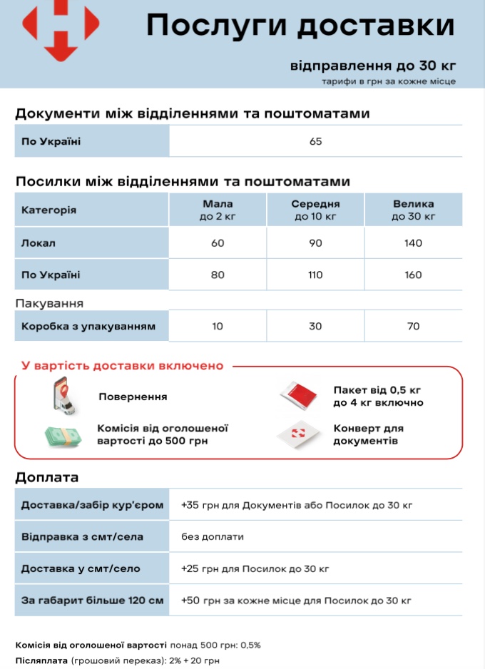 Доставка документів між відділеннями та поштоматами по місту та по Україні — 65 грн (+10 грн). У компанії нагадали, що у вартість уже входить фірмовий картонний конверт.