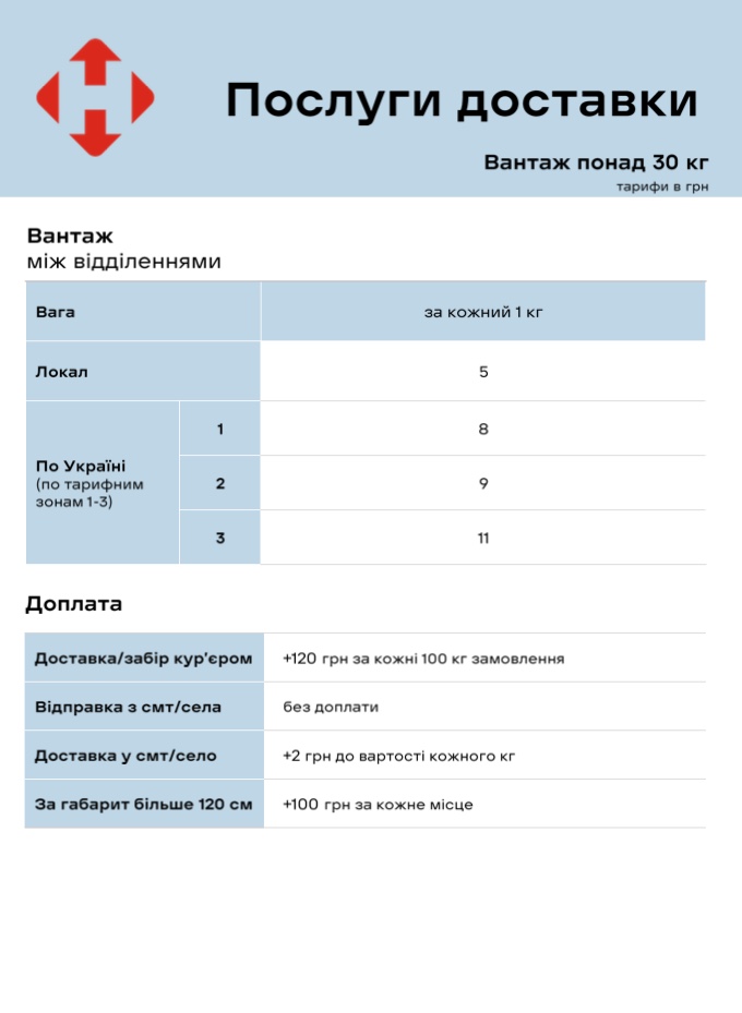• Вартість перевезення між відділеннями по Україні: +1 грн/кг